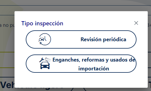 Ahora, lo siguiente será elegir el tipo de inspección. Solo hay 2 tipo, revisión periódica de ITV, y revisión por reforma o algún cambio en el vehículo.
