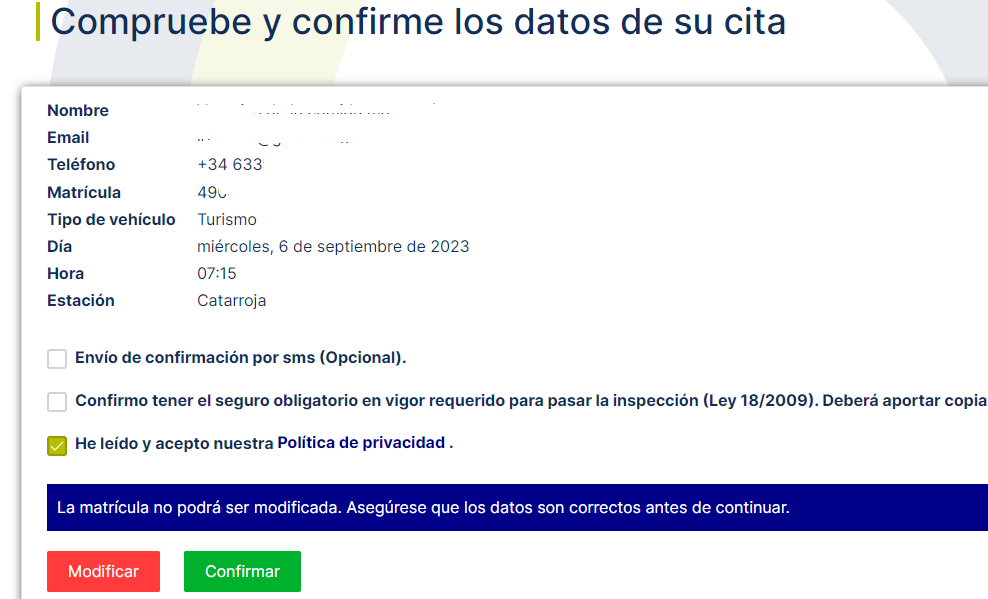 Lo último será confirmar los datos. Revisa que estén bien y dale a confirmar. Listo, ya tienes tu cita previa hecha.